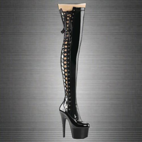 Step into confidence with these 7" SIDE LACE UP THIGH HIGH BOOTS. These boots feature a striking 7" heel with a 2 3/4" platform making a fashion statement wherever you go. The side lace ribbon adds a unique touch that allows for an adjustable fit and a chic flair. The versatile design also includes a side close zipper for added convenience.