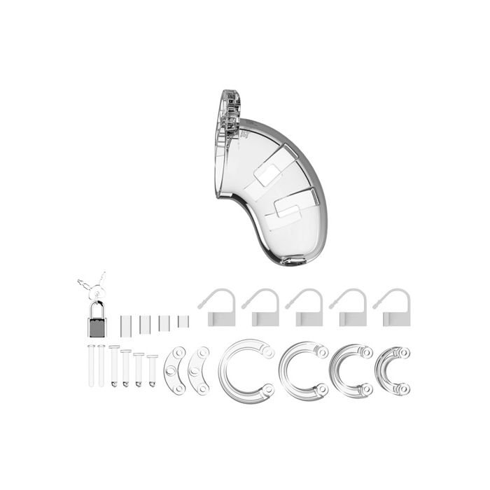 The CHASTITY CAGE WITH LOCK is manufactured from high-grade polycarbonate, a very light, durable and hypoallergenic material. The cage consists of three parts which fit perfectly together.