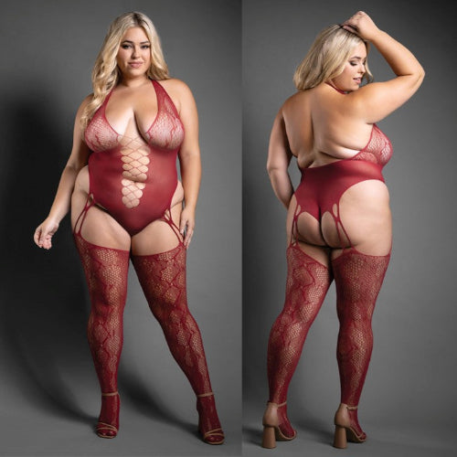 The stretch knit teddy has a versatile neckline and attached thigh high stockings so you can customize the fit and style to suit your mood or occasion—whether you want a classic plunge, halter style, or something more daring. The crotchless design offers an additional layer of allure, while the stretchy fabric ensures maximum comfort and flexibility making it a perfect choice for intimate moments.