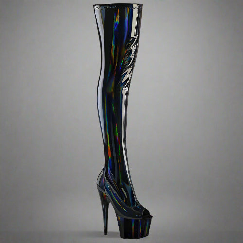 Step into stunning glamour with these 7-inch HOLOGRAPHIC PEEP TOE THIGH HIGH BOOTS, designed to make every entrance unforgettable. Featuring a 7-inch heel and a 2 3/4-inch platform, these stretch thigh high boots offer dramatic height and comfort for all-day wear. The peep toe design adds a flirty touch, while the full-length inner side zip closure ensures easy on-and-off and a secure fit for various leg sizes.