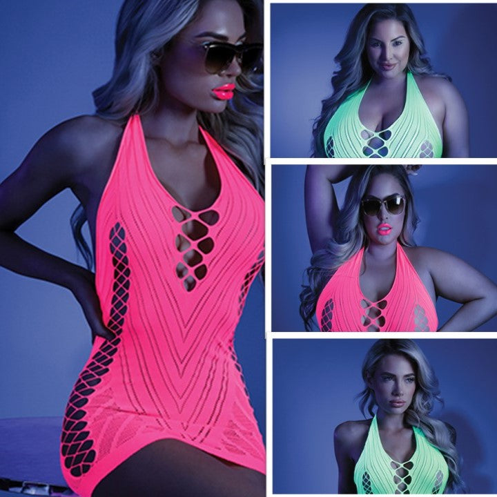 Showcase your boldest self with the THRILL OF THE NIGHT NEON DRESS a provocative black light effect lingerie piece that radiates confidence and allure. This figure-hugging neon dress features daring strategic cutouts that accentuate your curves, leaving little to the imagination. Designed to glow vibrantly under black light, it’s perfect for club nights, intimate moments, or themed parties. Pair it with stripper heels or thigh-high boots for a head-turning look that leaves your partner in awe. Crafted from stretchy, comfortable materials, this seductive lingerie empowers you to command attention and redefine sensuality with electrifying charm.